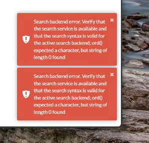 Search backend error. Verify that the search service is available and that the search syntax is valid for the active search backend; ord() expected a character, but string of length 0 found